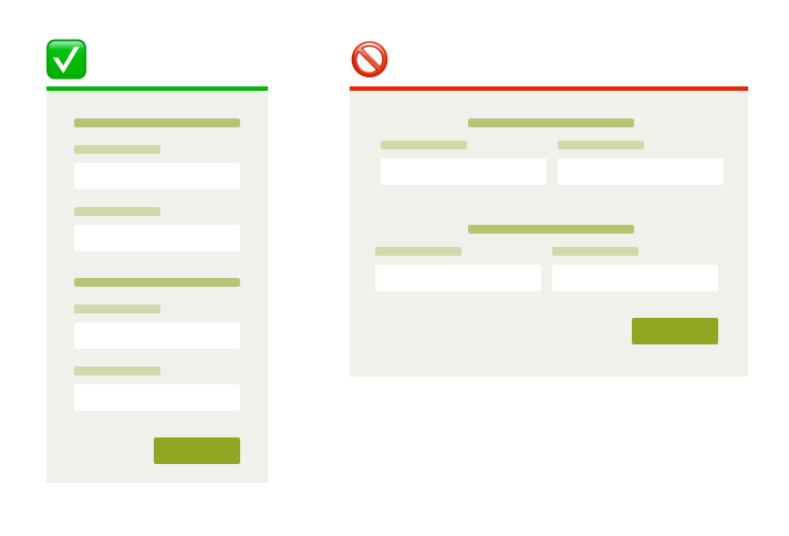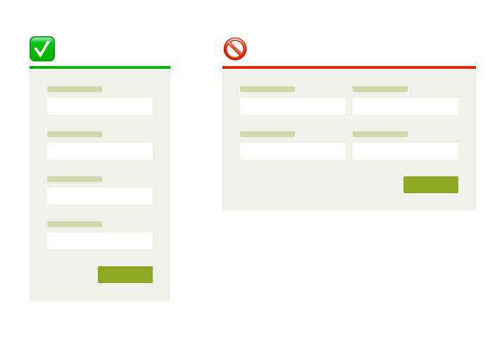 En general preferiremos siempre los formularios dispuestos en una sola columna. Evitaremos siempre diseñar formularios con varias columnas porque estos serán más costosos de rellenar, más ambiguos, más propensos a los errores y menos intuitivos.