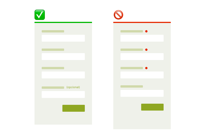 - Para indicar campos obligatorios solemos usar el estándar (*), es decir un asterisco junto a la etiqueta del campo.