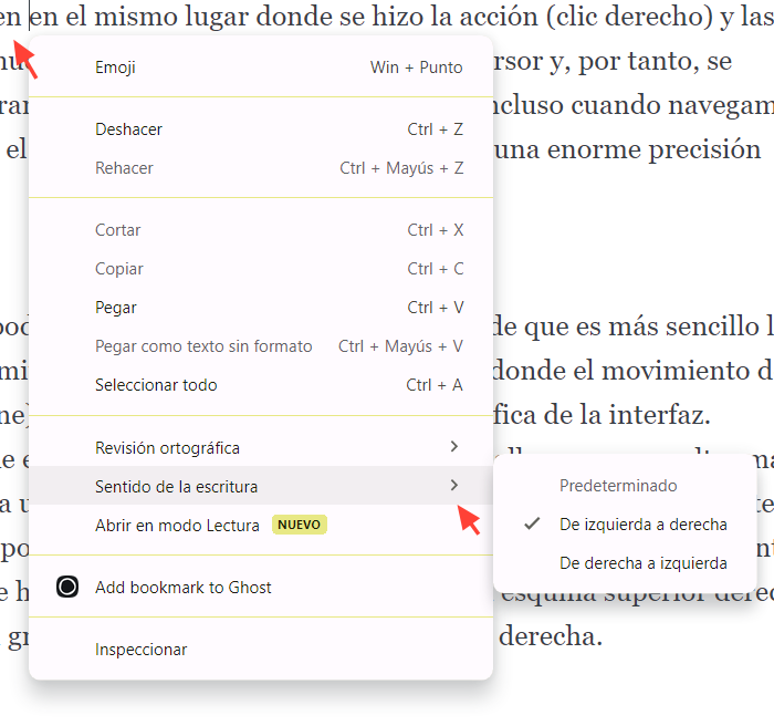 Los menús contextuales son un claro ejemplo del uso de esta ley. Primero porque aparecen en el mismo lugar donde se hizo la acción (clic derecho) y las opciones que muestran se encuentran muy cerca del cursor y, por tanto, se alcanzan con gran rapidez. En segundo lugar, porque incluso cuando navegamos por submenús, se tiene en cuenta esta ley para facilitar la falta de precisión del recorrido del ratón cuando se mueve de un elemento principal a un submenú.