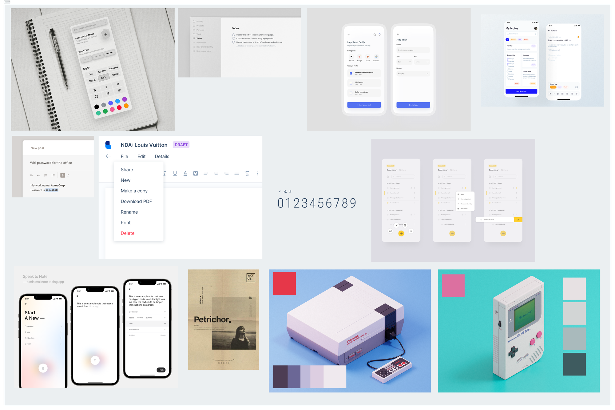 También podemos crear junto a ellos un pequeño moodboard, con diseños que nos hayan inspirado y que estén relacionados con alguno de esos conceptos. No nos preocuparemos por ponerle orden, sino simplemente ir coleccionando esas ideas para tenerlas a mano. Incluso si nos atrae una idea por su aspecto visual es bueno volcarla en este moodboard para ser capaces de abstraerla y representarla a bajo nivel.